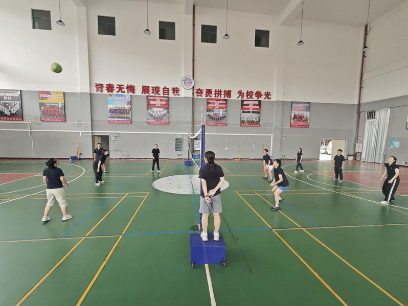 随后的“集体跳绳”项目,王偲宇、岳艳丽两位老师负责摇绳,其余老师整齐有序地进入绳中,共同向着“连续跳30次无中断”的目标努力,现场加油声、欢呼声不断。分组对抗环节紧张又刺激。“达芬奇密码(顺序翻牌)”项目里,两队队员轮流上场,凭借记忆力与团队沟通,快速记忆纸牌位置与数字,争分夺秒按顺序翻牌,现场氛围紧张激烈;“气排球”比赛中,两队各派出5名队员,严格遵循气排球常规规则展开对决,队员们默契传球、奋力扣杀,充分展现出拼搏进取的精神,最终比分定格的瞬间,无论胜负,老师们脸上都洋溢着笑容。对抗环节全程由邹小驹、黄苑玲老师担任仲裁与裁判,确保比赛公平公正。